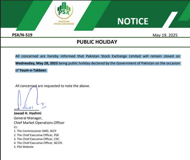 پی ایس ایکس نوٹس کےمطابق 28 مئی کو سرکاری چھٹی کے باعث مارکیٹ کاروبار کے لیے بند رہے گی۔تاہم ابھی سرکاری سطح پر 28 مئی کے موقع پر تعطیل سے متعلق خبر سامنے نہیں آئی۔