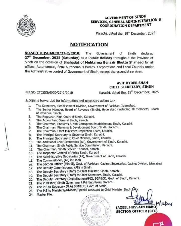 سندھ بھر میں 27 دسمبر کو عام تعطیل کا اعلان، نوٹیفکیشن جاری کردیا گیا۔