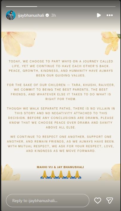 بھارتی ٹی وی اداکارجےبھانوشالی نےاپنی انسٹاگرام اسٹوری کےذریعےتصدیق کی ہےہم دونوں باہمی رضا مندی سے علیحدگی کا فیصلہ کیا ہے۔