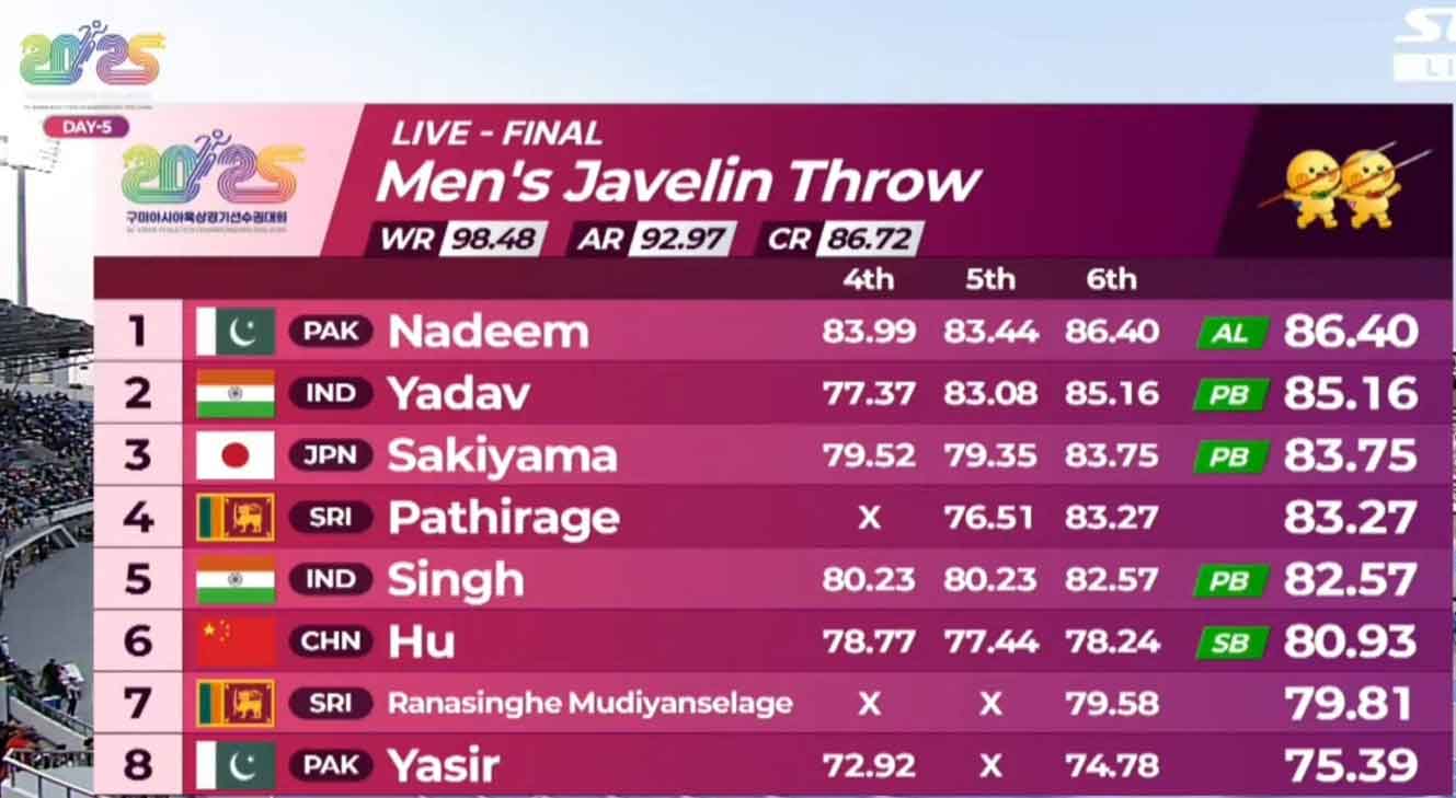 جنوبی کوریا میں ہونے والے ایشین ایتھلیٹکس چیمپئن شپ کے فائنل میں ارشد ندیم نے پہلی تھرو75.64،دوسری 76.80 ،تیسری باری میں85.57میٹر کی تھرو کی،چوتھی ،83.99، آخری 86.40 میٹرکی چھٹی تھرو پھینک کر ایشین چیمپئن بھی بن گئے،بھارت کے سچن یادو دوسرے نمبر پر رہے۔